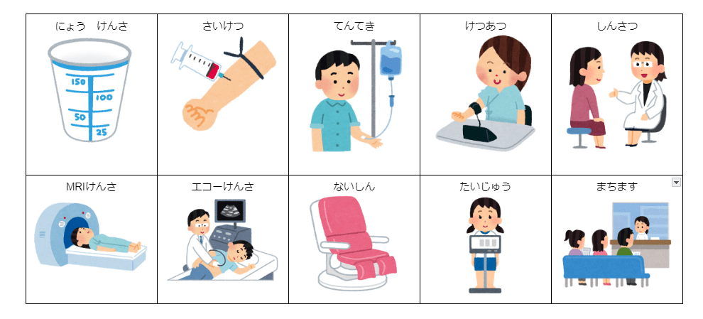 娘はいつもは話が入りますが、混乱した時や不安がピークの時は、視覚支援だけしか入らなくなる時があります。そして不安な時は、私に何度も何度も確認してくるのです。なので、一目瞭然の絵カードを作りました。「次はこの検査だよ~」と見せるためです。